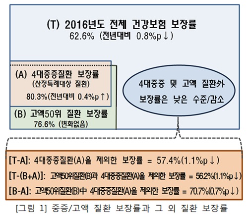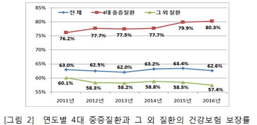 4대 중증질환은 2011년 보장률이 76.2%에서 2016년에 80.3%로 증가한데 비해, 이와 같은 기간 다른 질환의 보장률은 60.1%에서 57.4%로 감소하고 있는 것으로 조사됐다.