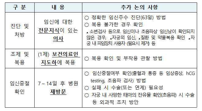 임신중절 확인 방법으로는 7~14일 후 병원 재방문을 제시했다. 출혈과 통증 등 임상증상, hCG testing, 초음파 검사 등 임신중절여부 확인 방법은 추가 논의 사항에 올랐다.