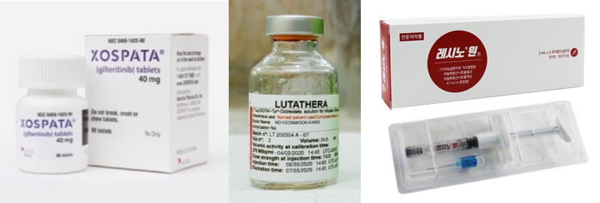 먼저 급성 골수성 백혈병 치료제 '조스파타(성분명 길테리티닙)', 위장관‧췌장 신경내분비암 치료제 '루타테라(성분명 루테튬(177Lu) 옥소도트레오타이드)', 골관절염 치료제 '레시노원(디비닐설폰으로 가교결합된 히알루론산나트륨겔과 히알루론산나트륨액의 4:1 w/w 혼합겔)' 등 3개 의약품(총 7개 품목)에 대해 건강보험이 신규로 적용된다.