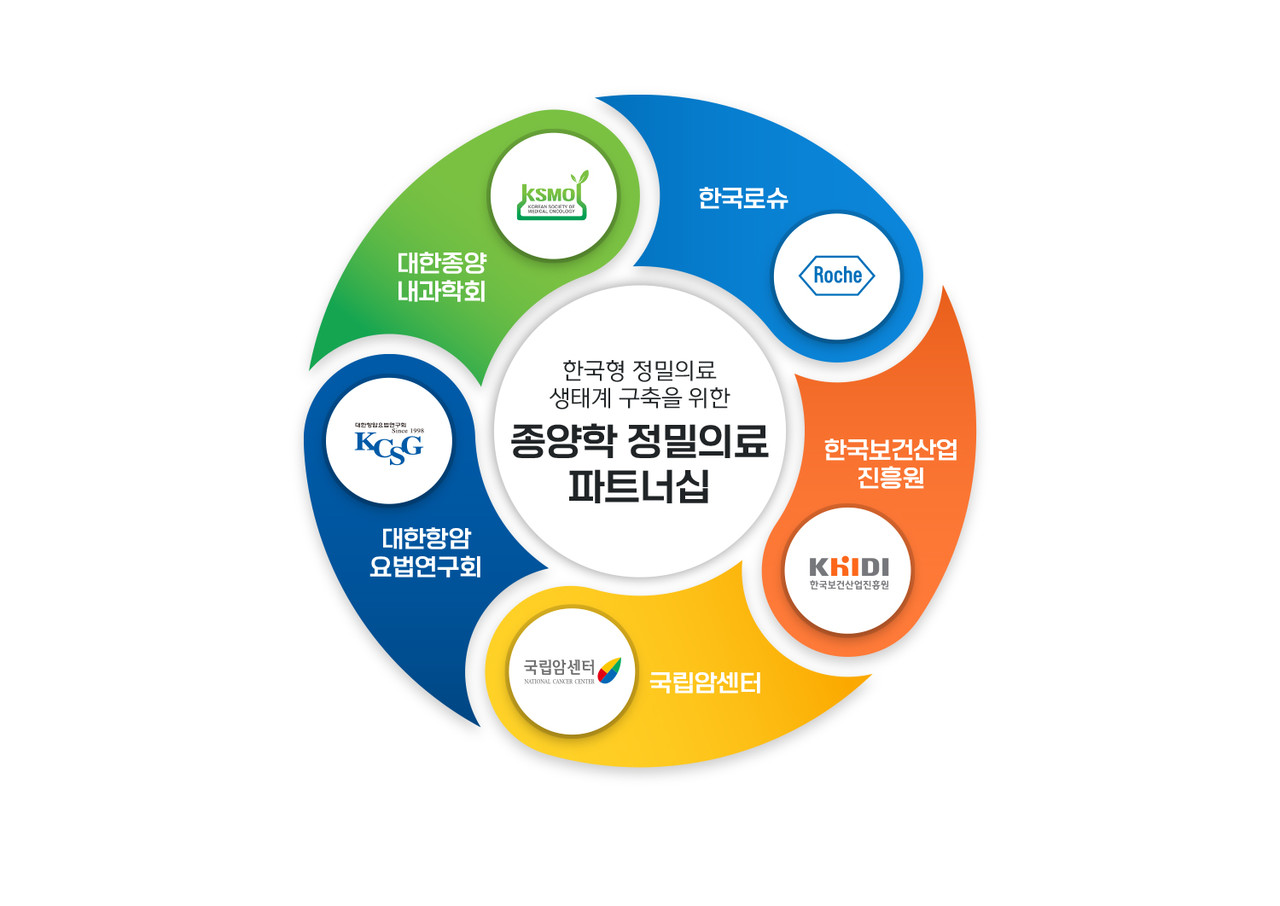 대한종양내과학회, 대한항암요법연구회, 국립암센터, 한국보건산업진흥원, 한국로슈 등 5개 기관이 한국형 정밀의료 생태계 구축을 위한 파트너십을 맺었다.