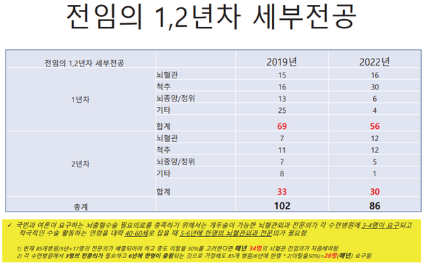 신경외과학회 김대현 수련교육이사가 이날 공개한 신경외과 전공의와 전임의 현황 자료에 따르면 2019년 뇌혈관외과 세부전공 전임의 1년차는 15명, 2년차는 7명이었고 2022년은 1년차 16명, 2년차 12명이다.