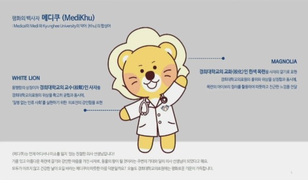 경희대를 상징하는 교수와 교화인 목련, 그리고 사자를 캐릭터로 디자인한 ‘메디쿠(MediKhu)’는 동물의 왕이 될 거라는 주변의 기대와 달리 모두가 아프지 않고 건강한 날이 오길 바라는 마음에서 의사가 된 사자다.