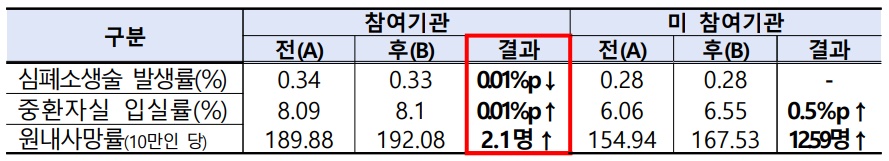 이 외 ▲중환자실 입실률은 미참여기관이 0.5%p 증가한 반면 참여기관은 0.01%p 증가했으며 ▲입원환자 10만명당 원내 사망자 수는 시범사업 전후로 참여기관은 2.1명 증가한 반면 미참여기관은 12.59명 증가했다.
