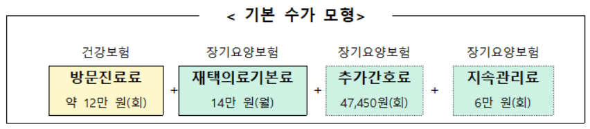 급여는 건강보험에서 지원하는 시범사업 수가가 방문진료 방문당 약 12만원에 본인부담 30%, 장기요양보험에서 지원하는 재택의료기본료는 환자당 월 14만원에 본인부담은 없다.