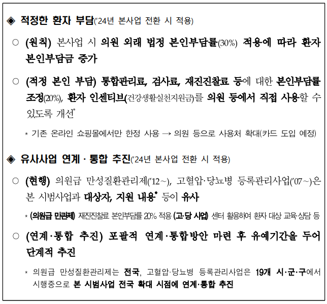 또한 본사업 전환 시 현재 ‘의원급 만성질환관리제’, ‘고혈압‧당뇨병 등록관리사업’ 등 시범사업과 대상자와 지원 내용이 유사한 사업을 연계‧통합한다.