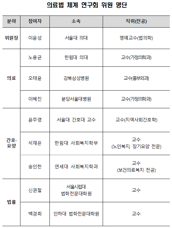 간호, 요양분야에서는 서울대 간호대 윤주영 교수, 한림대 사회복지학부 석재은 교수, 연세대 사회복지학과 송인한 교수가, 법률분야에서는 서울시립대 법학전문대학원 신권철 교수, 인하대 법학전문대학원 백경희 교수가 참여한다.