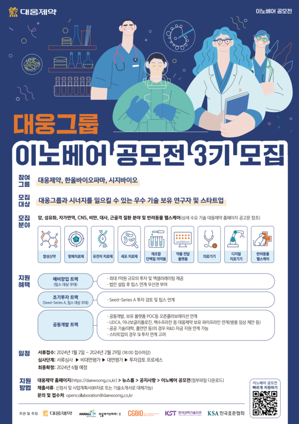 대웅제약(대표 전승호·이창재)은 기술 협력에 관심 있는 국내 유망 제약·바이오 및 헬스케어 스타트업을 발굴, 육성하기 위한 ‘이노베어 공모전’을 실시한다고 3일 밝혔다.