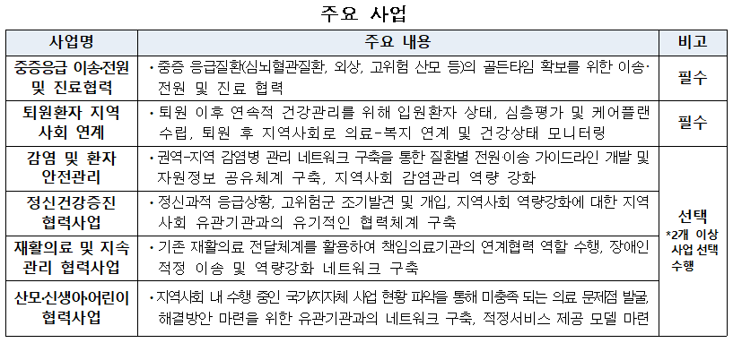 복지부는 지역‧필수의료 강화 및 지역 내 보건의료기관 간 협력을 확대하기 위해 2019년부터 책임의료기관을 지정‧운영하고 있으며 이번 공모에서는 1개 권역 및 14개 지역의 책임의료기관을 추가로 선정한다.