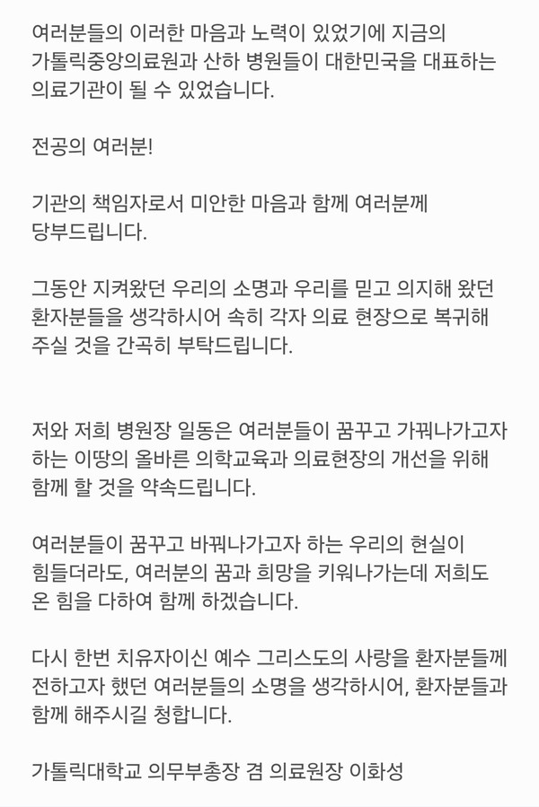 가톨릭중앙의료원에 따르면, 지난 2월 29일 이화성 가톨릭대 의무부총장 겸 의료원장은 의료원 산하 병원에서 수련 중인 전공의들에게 병원 복귀를 요청하는 문자와 메일을 보냈다.
