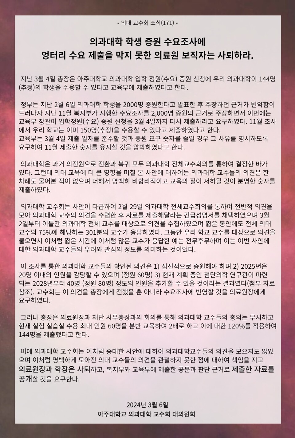 특히 아주의대 교수 중 75%가 참여한 설문에서는 ▲점진적 증원 ▲2025년은 20명 이내 인원 신규 정원 감당 가능 ▲2028년부터 신규 정원 40명 가능 등의 의견이 나와 전달했지만 무시당했다며 의대 교수들의 의견을 모으지도 못하고 관철시키지도 못한 책임을 지고 의료원장과 학장은 사퇴하고 복지부와 교육부에 제출한 의대 정원 증원 관련 자료를 공개하라고 요구했다.