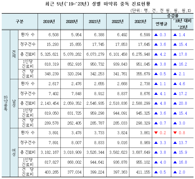 최근 5년간 마약류 중독 진료 추이를 분석한 결과, 환자 수가 1.4%(연평균 0.3%) 증가할 때, 진료비는 17.8%(연평균 4.2%) 증가했으며 성별로는 남성이 여성보다 증가율이 높게 나타났다.