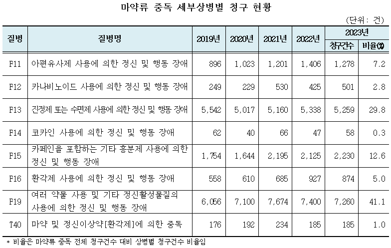 2023년 마약류 중독 세부상병별 청구 현황을 보면, 여러 약물 사용 및 기타 정신활성물질의 사용에 의한 정신 및 행동장애 41.1%, 진정제 또는 수면제 사용에 의한 정신 및 행동 장애 29.8% 순으로 나타났다.
