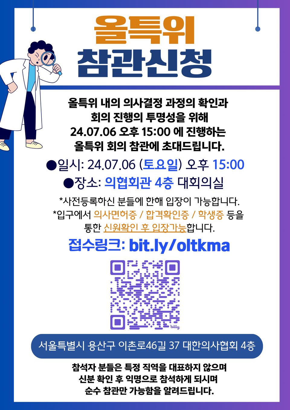 임진수 기획이사는 "참관자 익명성은 철저하게 보장하겠다"며 "올특위가 독단적인 밀실 협상용 협의체가 아니라는 점을 직접 확인할 수 있는 자리로 마련했다. 협회 동향에 관심을 갖고 목소리 내고자 하는 젊은 의사를 위한 결정"이라고 했다.