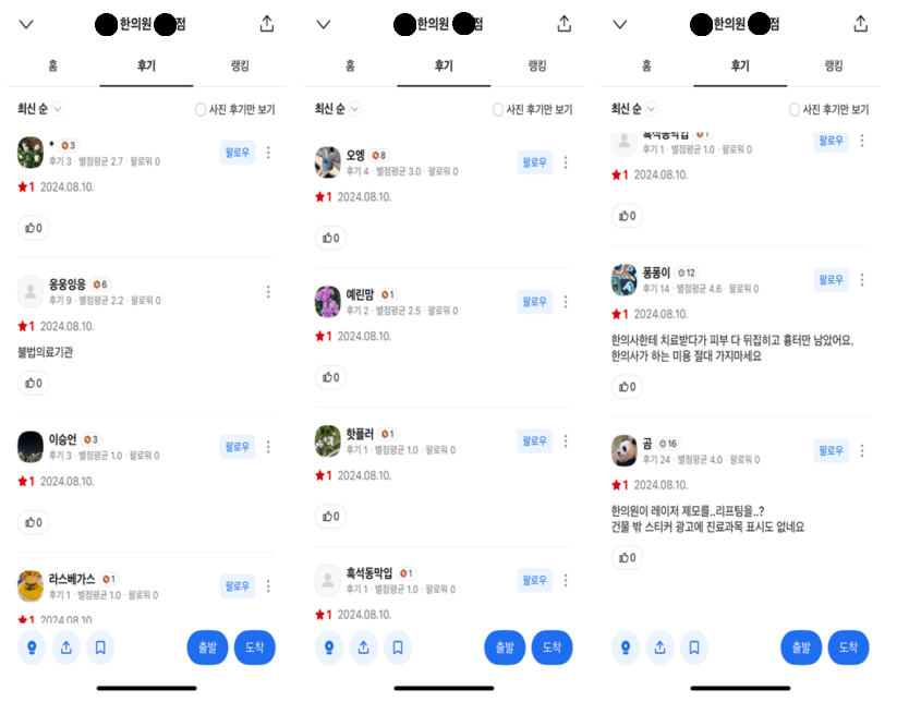 이에 A한의원 대표원장은 “영업 시작 전부터 각종 온라인 별점 테러로 인해 불의의 피해를 받고 있다”며 이에 강경하게 대처하겠다“고 밝혔다.