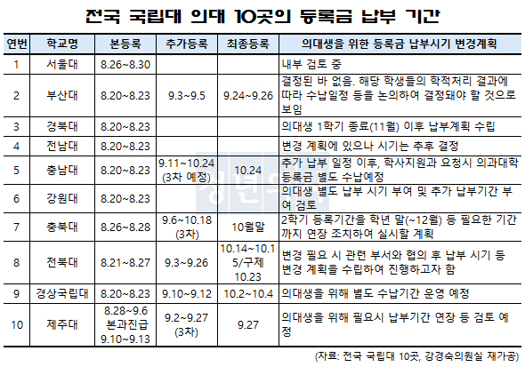 국립의대 6곳은 의대생들을 위해 오는 9월초 추가 등록 기간을 운영하기로 결정했다. 제주대가 오는 9월 2일부터 2차 등록을 시작하며 부산대와 전북대는 3일, 충북대 6일, 경상국립대 10일, 충남대는 11일부터 2차 등록이 있다.
