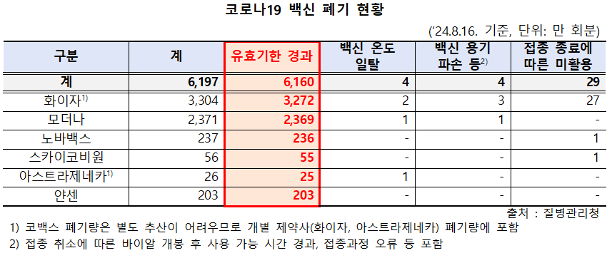 2024년 8월 현재까지 폐기된 코로나19 백신 물량은 총 6,197만 회분으로 사유별로는 ▲유효기간 경과가 6,160만 회분으로 가장 많았고 ▲접종 종료에 따른 미활용 29만 회분 ▲백신 온도 일탈 및 백신 용기 파손 등이 각각 4만 회분으로 파악됐다.