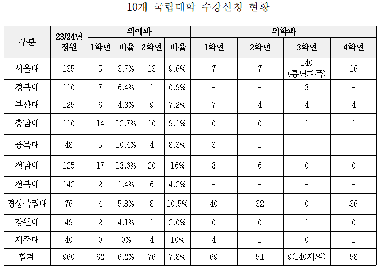 구체적으로 살펴보면 제주의대 의예과 1학년 학생들은 한 명도 수강신청을 하지 않았고, 전북의대는 전체 정원 중 1.4%만 수강신청을 완료했다.