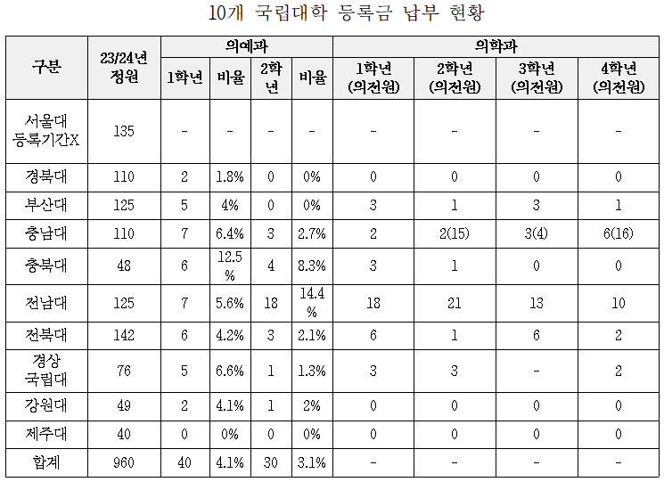 학교별로 살펴보면 제주의대는 의예과 1학년과 2학년 모두 등록금을 일체 납부하지 않았으며, 경북의대는 의예과 1학년 학생 두 명만 등록금을 납부했다.