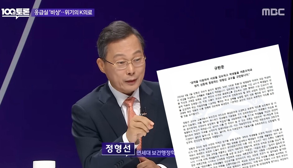 연세원주의대 비상시국대응위원회(TF)는 지난 10일 규탄문을 통해 “권력을 이용해 사상을 강요하고 학생들을 여론 조작과 정치 선동에 동원하는 정 교수를 규탄한다”고 밝혔다.