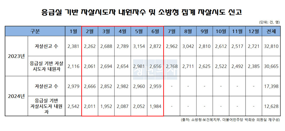 26일 더불어민주당 박희승 의원이 보건복지부로부터 받은 ‘응급실 기반 자살시도자 내원자 현황자료’에 따르면 의정 갈등이 발생한 지난 2월부터 6월까지 소방청이 받은 자살신고는 1만4,419건으로 전년 동기 대비 543건 증가했다.