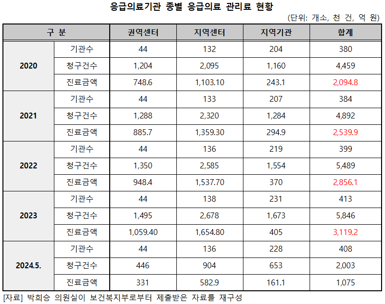 박 의원에 따르면 지난해 응급의료기관에서 비응급환자에게 징수한 응급의료관리료는 3,119억원으로 지난 2020년 2,095억원 대비 1.5배 증가했다. 청구건수도 2020년 445만9,000건에서 지난해 584만6,000건으로 1.3배 늘었다.