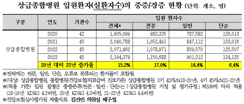 김 의원에 따르면 2020년부터 2023년까지 상급종합병원의 전체 입원환자수(실환자)는 2020년 190만명에서 2023년 219만명으로 15.2% 증가했다.