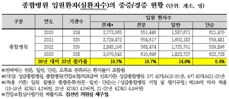 종합병원의 입원환자수(실환자)도 2020년 277만명에서 2023년 307만명으로 약 10.7% 증가했다. 이 중 중증환자는 2020년 55만명에서 2023년 61만명으로 10.7% 증가한 반면 경증환자는 2020년 62만명에서 2023년 62만명으로 0.4% 증가한 것으로 나타났다.
