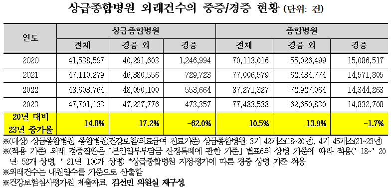 종합병원에서도 전체 외래건수는 2020년 7,011만건에서 2023년 7,748만건으로 10.5%증가했지만 이중 경증 외 환자는 2020년 5,502만건에서 2023년 6,265만건으로 13.9% 증가한 반면 경증환자는 1,508만건에서 1,483만건으로 1.7% 감소한 것으로 나타났다.