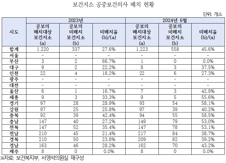 서 의원에 따르면 2024년 6월 기준 전국 138개 공보의 배치대상 보건소 중 9개소에 공보의가 배치되지 않은 것으로 나타났다. 더 큰 문제는 전국 1,223개 공보의 배치대상 보건지소 중 45.6%인 558개소에 공보의가 배치되지 않았다는 것이다.