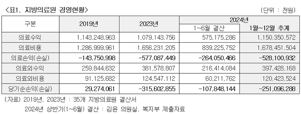 올해 지방의료원의 당기순이익 적자는 2,510억원에 이를 것으로 계산되기도 했다. 이는 각 지표의 2024년도 상반기 결산을 기준으로 두 배 곱해 추산한 수치다. 또한 의료 외 수익에는 올해 예산으로 지원된 ‘공공병원 경영혁신 지원사업 상·하반기 지원금 876억원을 반영했다.