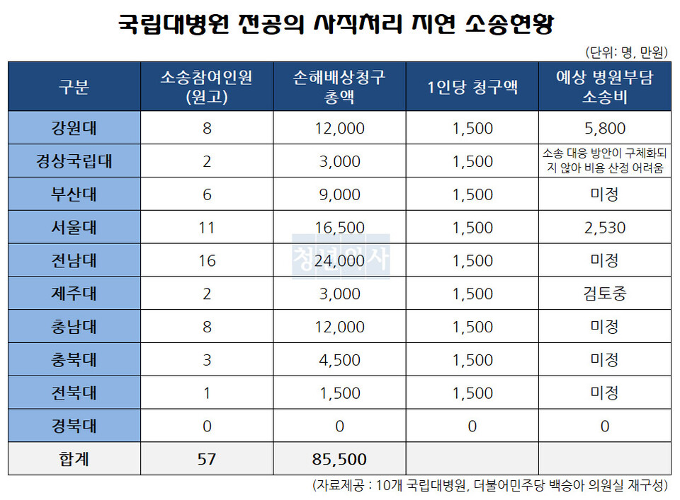 15일 더불어민주당 백승아 의원이 국립대병원 10곳으로부터 받은 ‘전공의 사직 처리 지연 소송현황 자료’에 따르면 국립대병원 9곳을 대상으로 전공의 총 57명이 손해배상 소송을 제기한 것으로 확인됐다. 1인당 청구금액은 1,500만원으로 전체 청구금액은 총 8억5,500만원이다. 경북대병원 사직 전공의들은 소송에 참여하지 않았다.