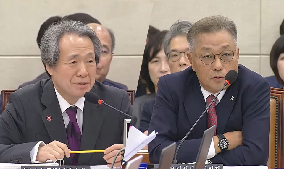 휴학이 ‘개인 권리’인지 묻는 질의에서도 강 원장은 ”개인 권리“라고 답했지만 정 이사장은 ”잘 모르겠다“며 모호하게 답변했다. 또 의대 교육과정을 5년제로 단축하는 방안에 대해 강 원장은 ”5년은 불가능하다“고 잘라 답했지만 정 이사장은 ”잘 모르겠다“며 의견 피력을 피했다.