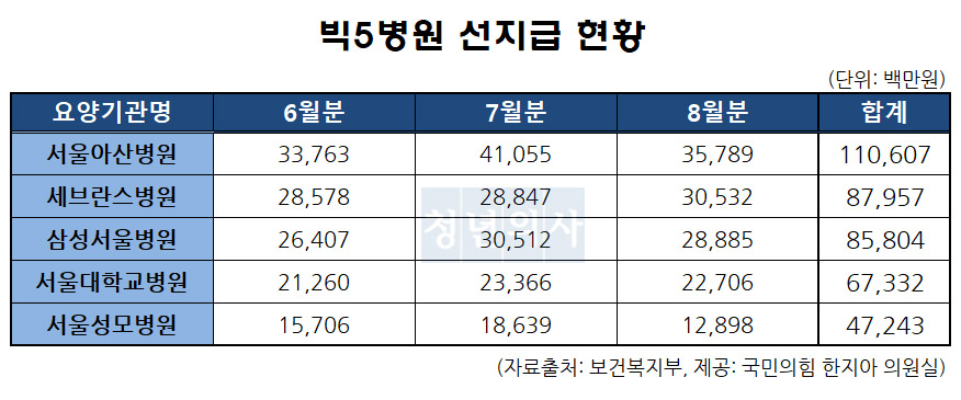 역시 ‘빅5병원’에 선지급된 건강보험 급여비가 가장 컸다. 서울아산병원은 6월분 337억6,300만원, 7월분 410억5,500만원, 8월분 357억8,900만원 등 총 1,106억7,000만원을 받았다.