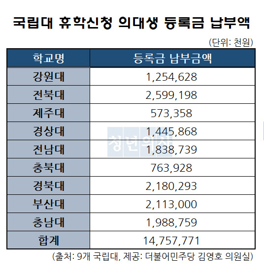 지난 18일 국회 교육위원회 위원장인 더불어민주당 김영호 의원이 국립대 9곳으로부터 받은 ‘2024학년도 1·2학기 휴학신청 의대생 등록금 납부액 자료’에 따르면 전체 의대생 4,200여명이 납부한 등록금은 총 147억5,772만원으로 집계됐다. 휴학을 승인한 서울대는 제외했다.