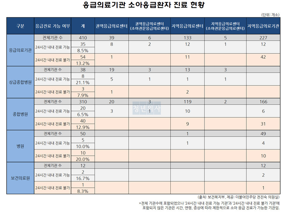 22일 더불어민주당 전진숙 의원이 보건복지부로부터 받은 ‘응급의료기관의 소아응급환자 진료현황 조사 자료’에 따르면 전체 응급의료기관 410곳 중 시간·연령·증상 제한 없이 24시간 소아 진료가 가능한 곳은 35곳(8.5%)이 전부다.