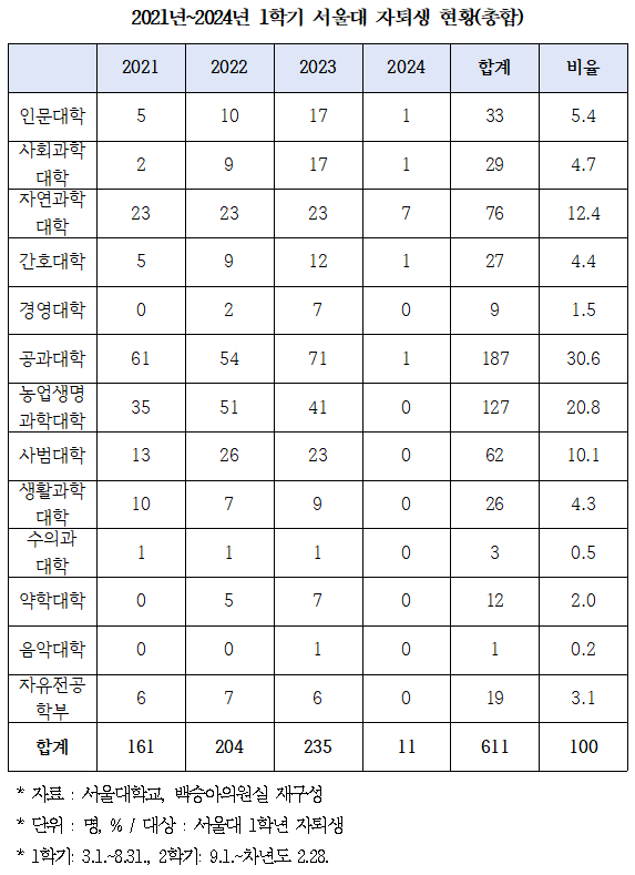 백 의원에 따르면 지난 2021년부터 2024년 1학기까지 총 611명의 서울대 신입생들이 자퇴했다. 연도별로 살펴보면 ▲2021년 161명 ▲2022년 204명 ▲2023년 235명이다. 2021년 대비 2023년 자퇴생 비율이 45.9% 증가했다.