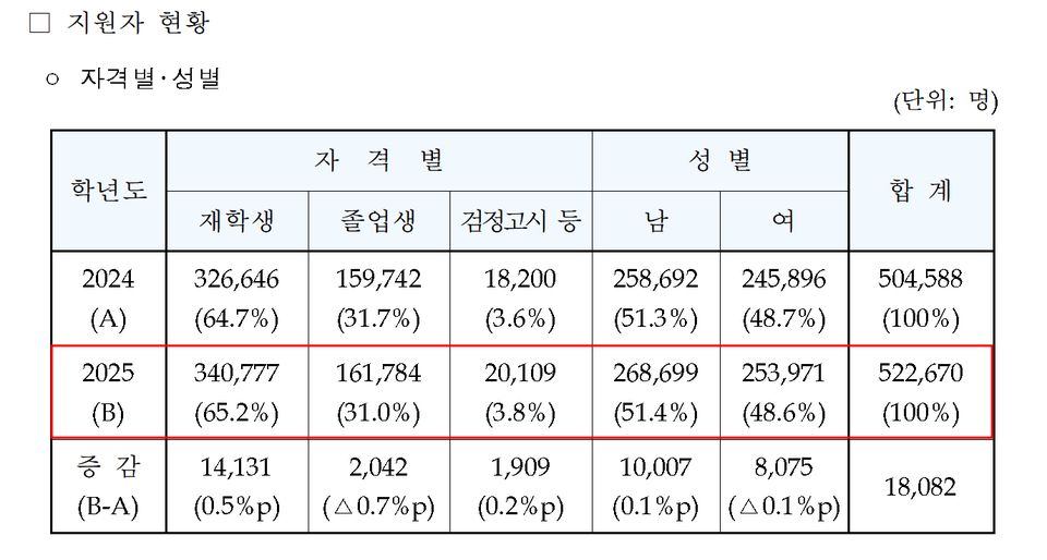 13일 교육부와 한국교육과정평가원에 따르면 2025학년도 수능 응시원서를 접수한 인원은 총 52만2,670명으로 지난해 대비 1만8,8082명 늘었다. 2025학년도 수능은 오는 14일이다.