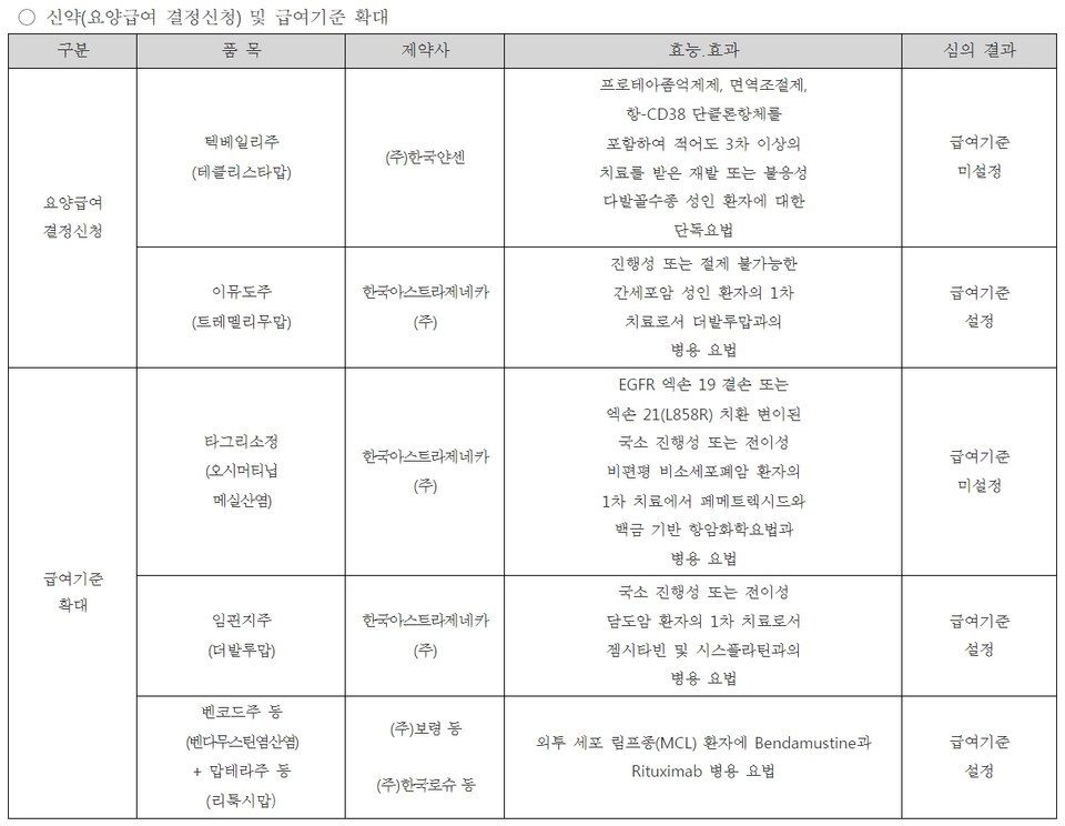 한편, 같은 날 심의 안건으로 오른 다발골수종 치료제 '텍베일리(성분명 테클리스타맙)'는 첫 번째 급여 도전에 실패했다.