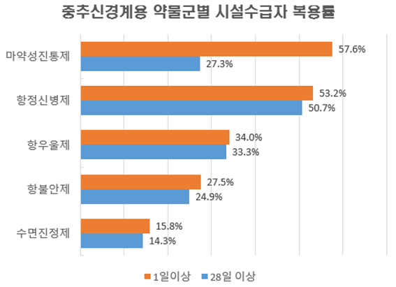 약물군별 복용률을 살펴보면, 마약성진통제의 경우 연간 1일 이상 복용률이 57.6%인 것에 비해 28일 이상 복용률은 27.3%로 크게 감소한 반면, 항정신병제는 연간 1일이상 복용률과 28일 이상 복용률이 각각 53.2%와 50.7%로 큰 차이가 없어 대부분 환자가 장기복용하고 있는 것으로 유추할 수 있다.