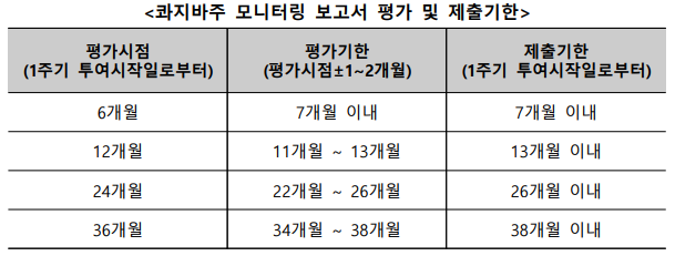 콰지바주 투여 모니터링 보고서는 투여 후 6개월 및 매 1년마다 고위험군의 경우 3년간, 재발성‧불응성은 2년간 제출하며, 각 평가시점의 평가시한 및 제출기한에 맞춰 환자상태를 평가해 제출해야 한다.