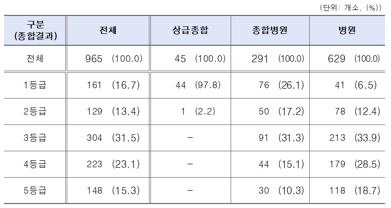 상급종합병원의 97.8%가 1등급을 유지하고 있으며, 종합병원과 병원은 각각 26.1%, 6.5%가 1등급으로 확인됐다.