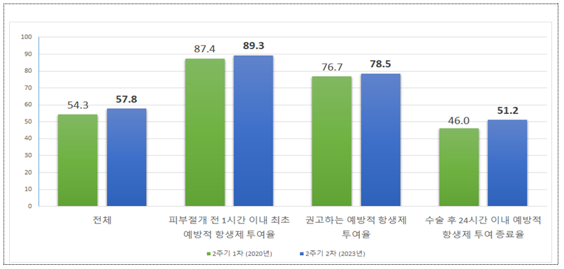 평가지표는 ▲최초 투여시기 관련 피부절개 전 1시간 이내 예방적 항생제 투여 종료율 ▲항생제 선택 관련 권고하는 예방적 항생제 투여율 ▲투여기간 관련 수술 후 24시간 이내 예방적 항생제 투여 종료율 등이었다.