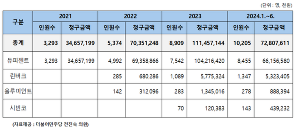 반면 린버크는 건강보험이 적용된 지난 2022년 285명(5.3%)에서 2023년 1,089명(12.2%), 2024년 6월 기준 1,347명(13.2%)로 꾸준히 늘고 있다.