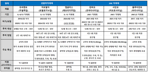현재 중증아토피 치료제로 건강보험이 적용되는 약제는 총 5종이다. 한국릴리의 엡글리스(레브리키주맙)가 출시돼 있지만 현재는 급여되지 않는다. 엡글리스가 급여된다면 생물학적제제 3종, JAK억제제 3종 총 6종이 중증아토피 치료에 활용되게 된다.