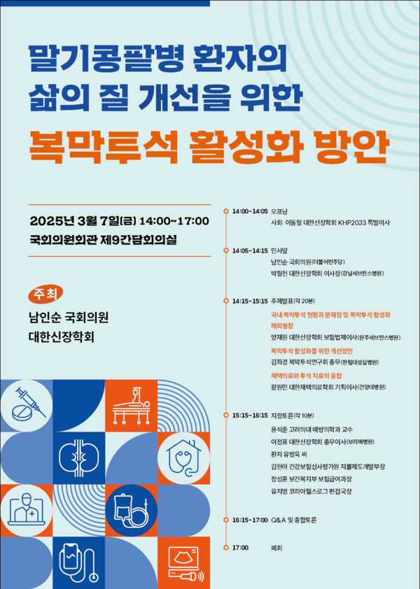 신장학회·남인순 의원, 7일 ‘복막투석 활성화 방안’ 토론회 개최