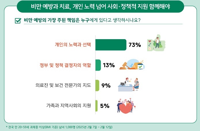 이날 설문조사 결과를 발표한 허양임 언론-홍보이사(차의과대 가정의학과)는 "특히, 비만 예방의 가장 주된 책임이 누구에게 있냐는 질문에서, 일반인 응답자의 73%가 '개인의 노력과 선택'이라고 답했다"면서 "비만 관리의 책임을 개인에게만 돌리는 인식이 여전히 만연해 있음을 알 수 있었다"고 강조했다(그림).