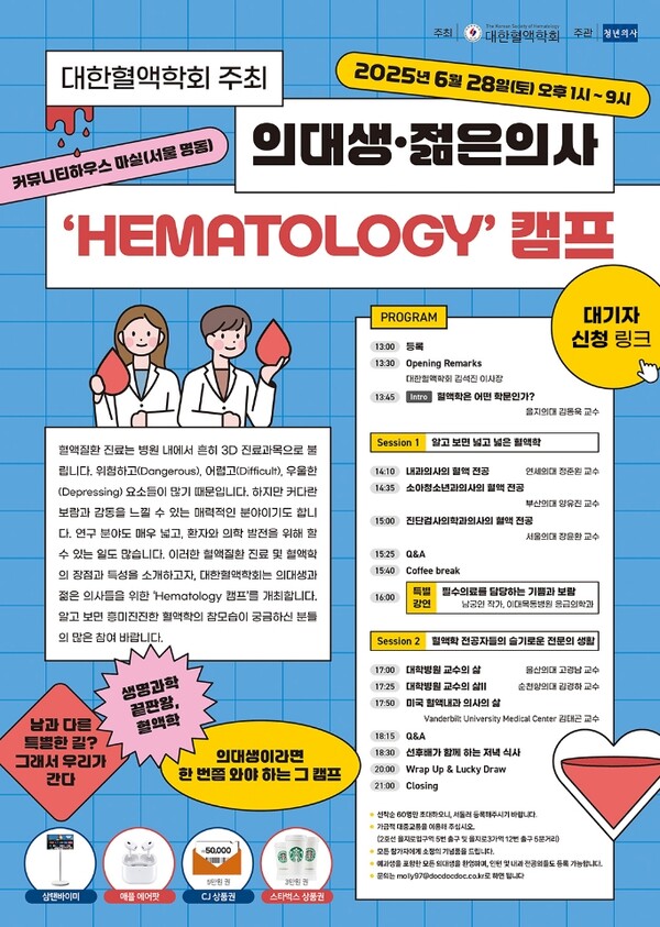 이러한 위기감에 대한혈액학회가 오는 28일 커뮤니티하우스 마실에서 의대생과 젊은 의사들을 위한 ‘Hematology 캠프’를 개최한다. ‘Hematology 캠프’를 통해 알고 보면 흥미진진한 혈액질환 진료 및 혈액학의 참모습을 소개하겠다는 생각이다.