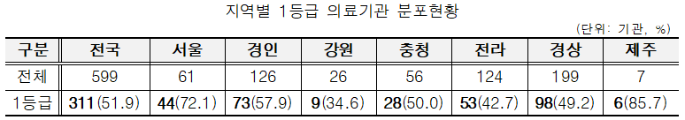 이번 평가결과를 살펴보면 종합점수 전체 평균은 82.9점이며 상급종합병원이 99.2점, 종합병원이 92.2점, 병원 66.8점으로 종별 편차를 보이고 있다. 종합점수에 따라 1~5등급으로 구분한 결과 1등급은 311기관으로 전국 모든 권역에 걸쳐 분포해 있다.