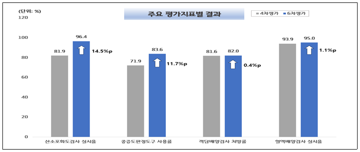 이 외 객담배양검사 처방률은 82.0%, 혈액배양검사 시행건수 중 첫 항생제 투여 전 혈액배양검사 실시율은 95.0%로 4차 평가 대비 각각 0.4%p, 1.1%p 향상됐다.