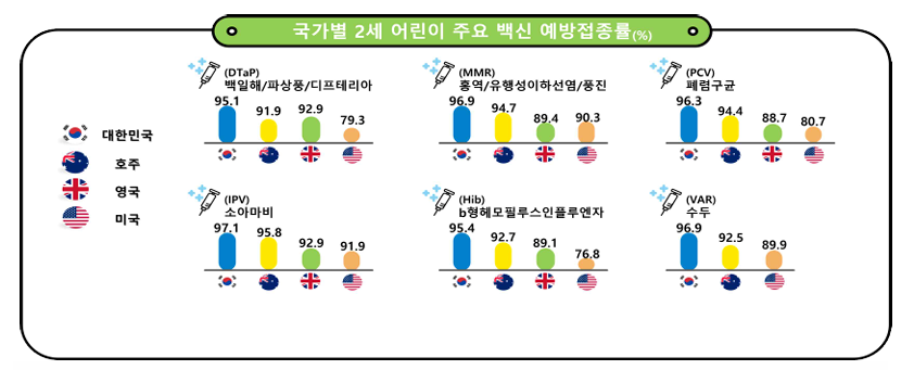 미국과 영국, 호주 등 해외 주요 국가들과 2세 어린이 백신 예방접종률 비교에서도 주요 6종 백신 모두 우리나라가 1%에서 최대 19%까지 높은 예방접종률을 보였다.